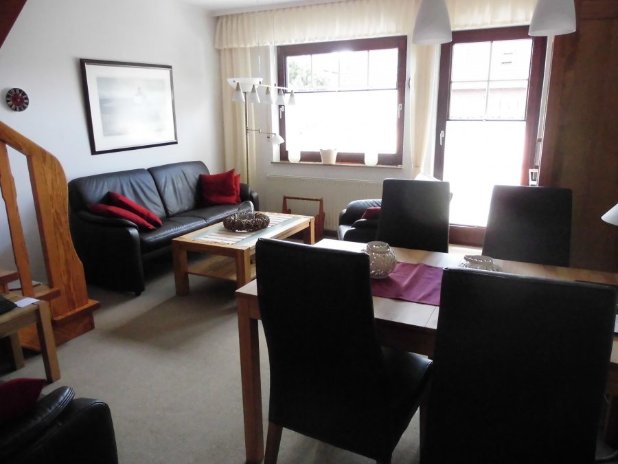 Wohn- Essbereich mit solider, lederner Ess- und Sitzgruppe, 1 Kinderhochstuhl, Sat-TV mit DVD-Player (große Auswahl an DVD`S), einem “Schätzchen” von Röhrenradio, CD – Spieler, viele Gesellschaftsspiele und Bücher, sowie Raclette und Fleisch- und Käsefondue und Teegeschirr “Friesenrose”