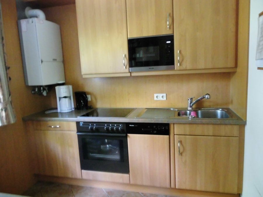Eine komplett ausgestattete moderne Einbauküche mit Miele Geschirrspüler und Microwelle, Kaffee – und Espressomaschine, Herd Ceranfeld, Abzugshaube Kühlschrank mit Gefrierfach, Ess- und Kaffee und Teegeschirr “Friesland” .