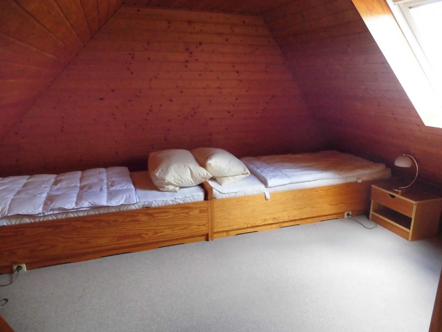Schlafraum “Elternzimmer” mit Ehebett (1,80 × 2m), großem Schwebetürenkleiderschrank, Spiegel und massivem Kiefernholzkinderbett. Das sogenannte “Kinderzimmer” mit eingebauter Bettkoje (1×2m) und Regalwand mit viel Kinderspielzeug und -büchern, Kinderreisebett, Treppengitter.
