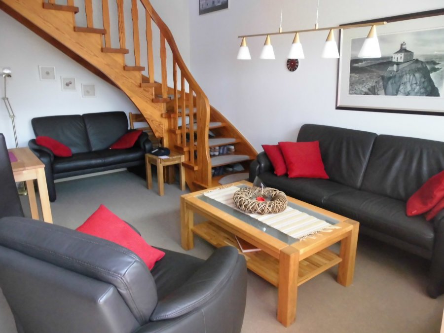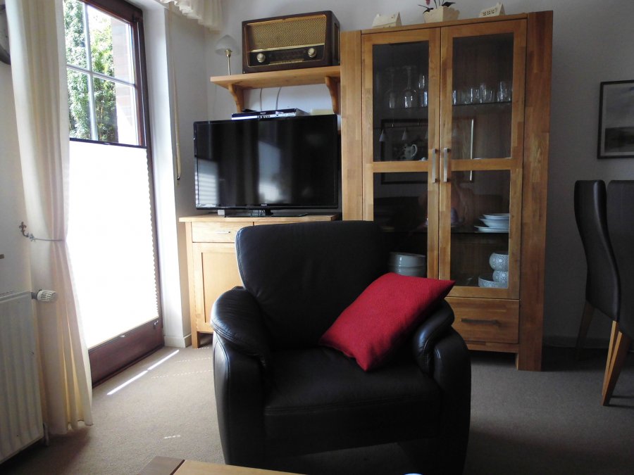 Wohn- Essbereich mit solider, lederner Ess- und Sitzgruppe, 1 Kinderhochstuhl, Sat-TV mit DVD-Player (große Auswahl an DVD`S), einem “Schätzchen” von Röhrenradio, CD – Spieler, viele Gesellschaftsspiele und Bücher, sowie Raclette und Fleisch- und Käsefondue und Teegeschirr “Friesenrose”