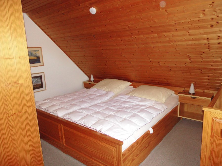 Schlafraum “Elternzimmer” mit Ehebett (1,80 × 2m), großem Schwebetürenkleiderschrank, Spiegel und massivem Kiefernholzkinderbett. Das sogenannte “Kinderzimmer” mit eingebauter Bettkoje (1×2m) und Regalwand mit viel Kinderspielzeug und -büchern, Kinderreisebett, Treppengitter.